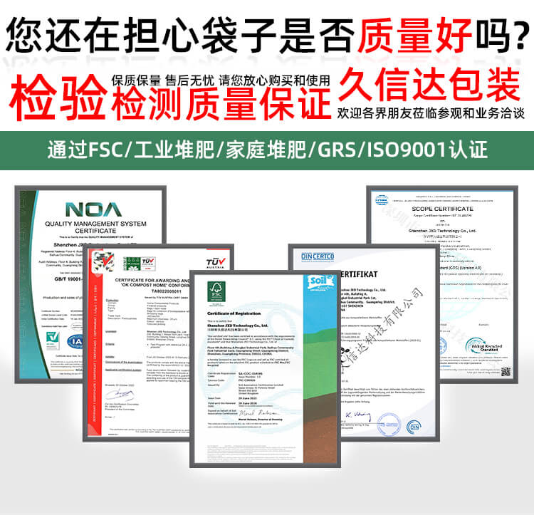 久信达15年专业生产、销售、定制生物降解袋、降解纤维袋、可回收胶袋、环保纸袋等,全生物降解、可堆肥、可回收,获得GRS认证,支持出口欧美标准。
